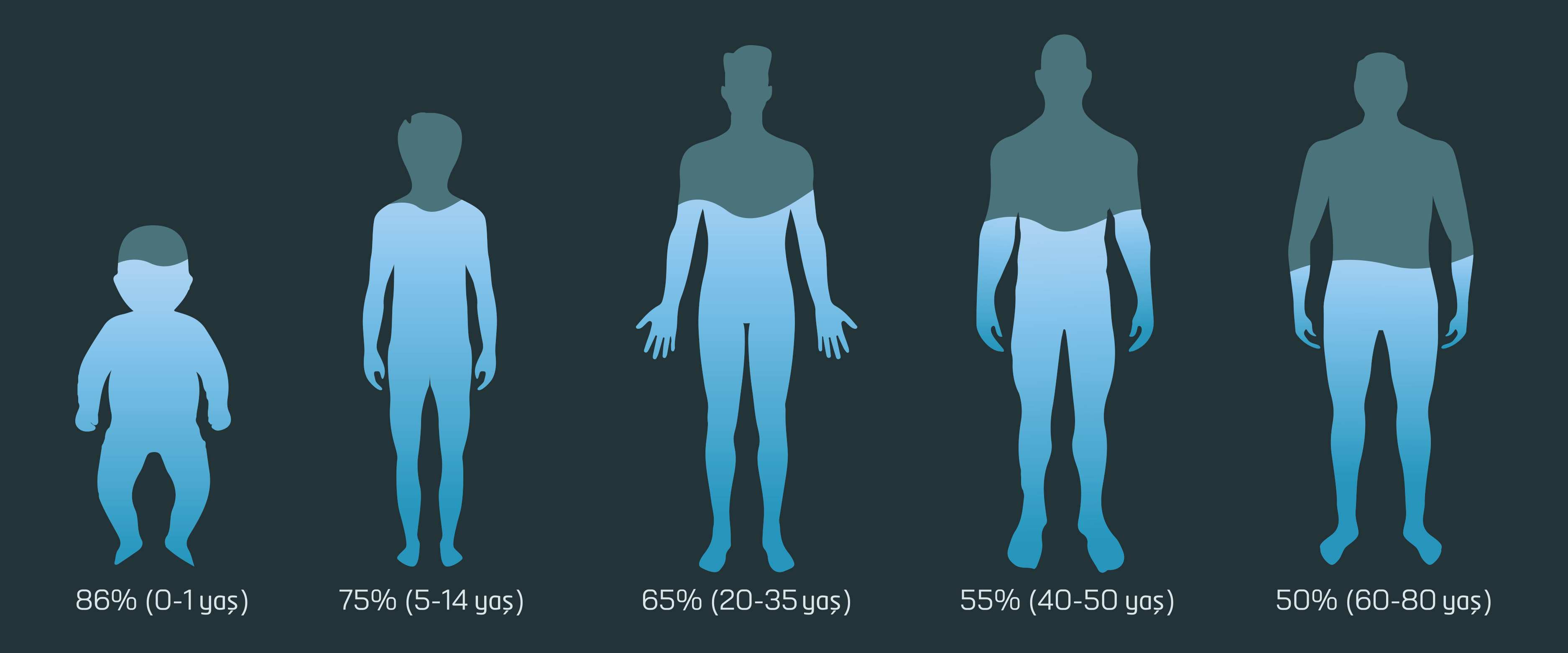 Kadınlar için önerilen günlük su tüketim miktarı ortalama 2.7 litre civarı, erkekler içinse 3.7 litre civarıdır. Çocuklar için önerilen günlük su tüketim miktarı da yaşa göre değişkenlik gösterir. 3 yaşa kadar yaklaşık 1.3, 8 yaşa kadar 1.7, 13 yaşa kadar 2.1, 18 yaşa kadar olan dönemde ise günde yaklaşık 2.3 litre su içilmesi önerilir.
